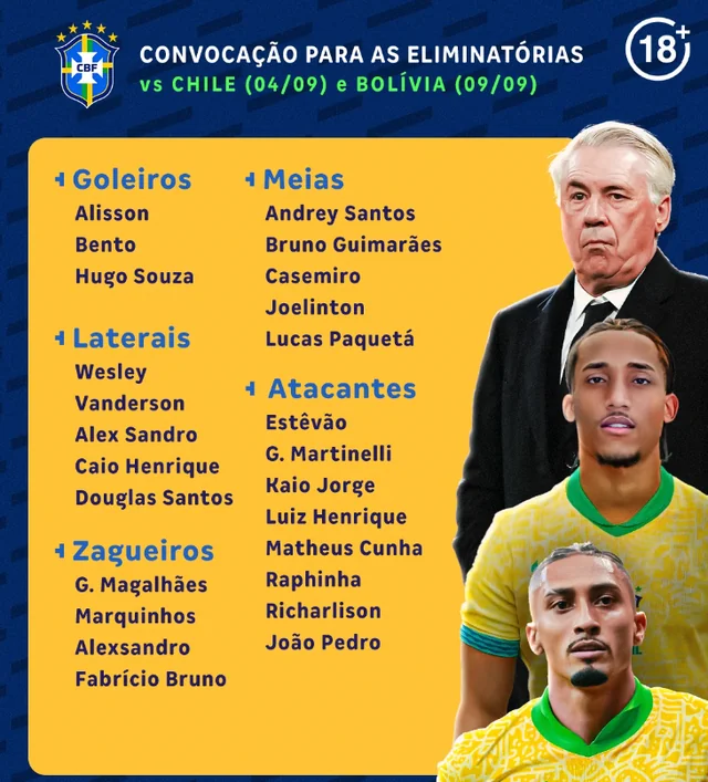A Seleção Brasileira recebe o Chile nesta quinta-feira (4), no Maracanã, em jogo válido pelas Eliminatórias da Copa do Mundo de 2026. Já garantido no torneio, o time comandado por Carlo Ancelotti encara a partida como oportunidade para dar rodagem ao elenco e testar jogadores que vivem grande fase o Brasil já classificado para a Copa e ocupando a terceira colocação, com 25 pontos. O Chile, por sua vez, é o lanterna, com apenas 10.